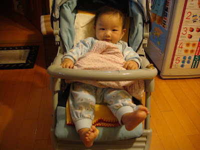 弟弟會坐了喔~~~喜歡吃雞肉泥 還有玩玩具跟看電視(超像爸爸) 恩 ....果然是父子!